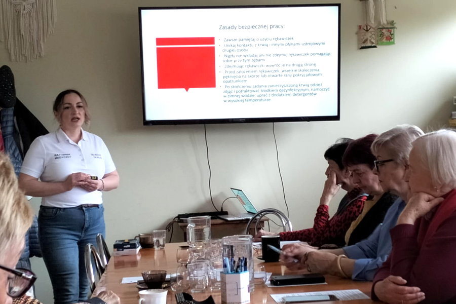 Omówione zostały również problemy zdrowotne seniorów min. reakcje alergiczne, pomoc przy cukrzycy i pierwsza pomoc w codziennych sytuacjach.